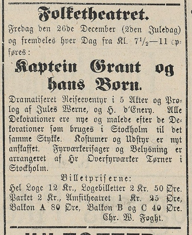 Her er avisutklipp som dokumenterer tidlige teateroppsetninger av Verne-stykker på 1800-tallet allerede:
