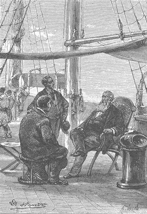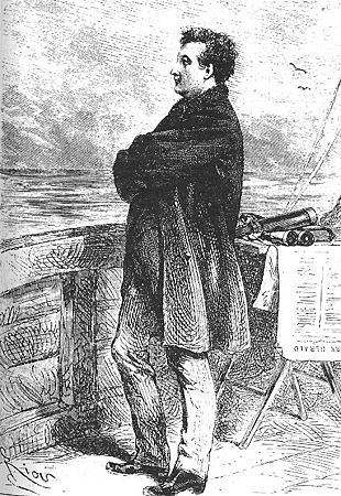 Illustrasjon som viser romanfiguren Mathias Sandorf (fra boken av samme navn) – Jules Verne satt modell for kunstneren (L.Benett) på dekket av sin egen yacht «St Michel III»: