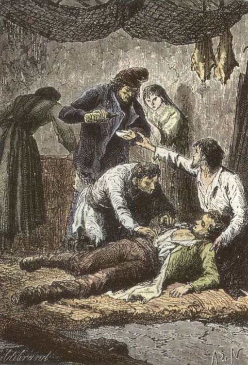 Aronnax, Conseil og Ned Land i et fiskernaust i Lofoten – fargeill. fra En verdensomseiling under havet: