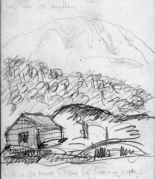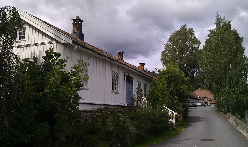 On Wednesday, they continued, on another coastal leg along the fjord, prolonging the mileage towards Drammen, their next stop, extensively. Either on or along the fjord, this is not completely clear. But seeing the area from a boat-deck in this very calm waters, was definately the most convenient way of travelling in those days. If they selected not to travel over land by horse and wagon, around the big Peninsula ‘Hurum’, between the Oslo- and Drammen -fjords Verne may have enjoyed the scenery from onboard the paddle steamer «St. Hallvard». In these area he also made a nice drawing of a wooden barn – that probably saw from the steamer, or one of the several stops along the shore.