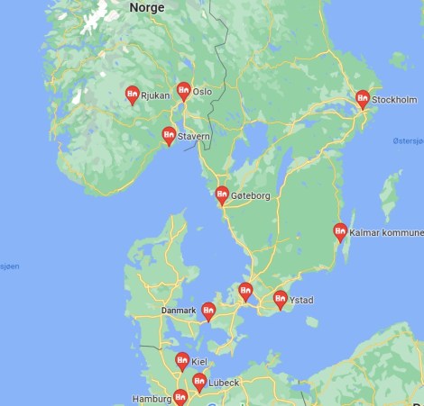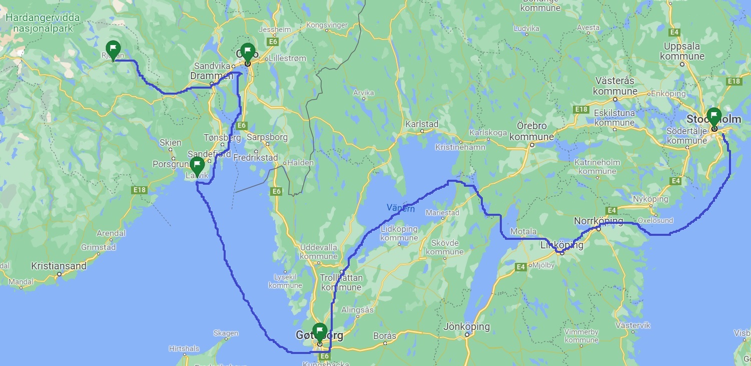 Paris – Hamburg – Lübeck – Ystad – Stockholm – Gothenburg – Stavern – Oslo (+ Eidsvoll/lake Mjösa) – Kongsberg – Heddal – Rjukan – Drammen – Oslo – Copenhagen – Korsör – Kiel