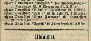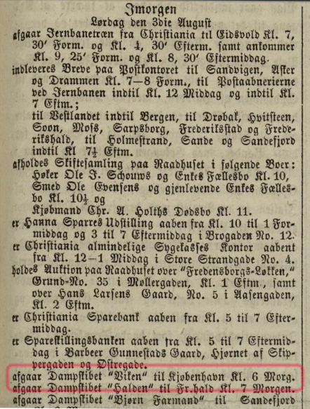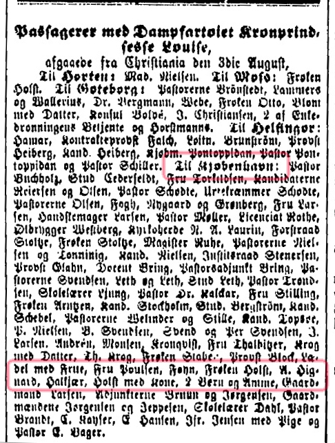This particular day however, according to newspaper Morgenbladet, «Viken» was replaced by the sister ship «Dampfartøiet Kronprindsesse Louise». On board, going southwards were probably the French friends . In news clip, at least the name ‘A.Hig-nard’ can be found, on the list of passengers onboard, bound for Helsingør and Copenhagen.