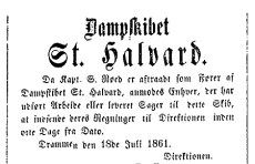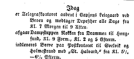 After three nights at the Dal guesthouse, going back down from Telemark, apparently Jules Verne passes the Tiness farm (at Notodden) once again. This means he selected the slightly longer southern route once more. Continuing from Drammen to Christiania, very likely he used the over-land transport provided by the Bennett agency, who was running a daily business with the diligence ‘Alliance’ (news-clip Aftenposten).