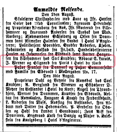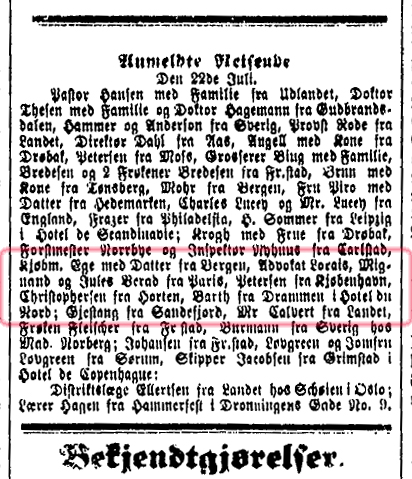 A comment might be added regarding Verne’s accomodation upon returning to the capital. The diary is not clear on this. In the newspaper Morgenbladet, where recent arrivals to the hotels are reported, on August 2, the following can be read (see clip): «Advocat E.Lorois, J. Werner og [Sk]ignard fra Paris i Hotel du Nord»