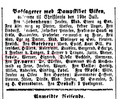 The arrivals of the mail steamer «Viken» was registered in the newspaper ‘Morgenbladet’ on a regular basis. For July 19 1861, we find the passengers who boarded the vessel i Gothenburg specified:
