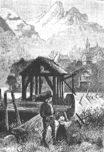 After commenting on slippery rocks in the foggy environment around the cascades, Jules Verne spend some time studying the mechanics of a water-driven sawmill, and after that apparently get a heavy meal before having decided on a new hike the next day. Reading this, there is reason to believe that Verne instructed illustrator George Roux, while doing the artwork for the novel Lottery Ticket, to include an image showing such a mechanical device that Verne himself saw at Rjukan – because this image has no direct connection to the story. In the novel, a short description of the sawmill serves as an introduction to the Dal hamlet, in the beginning of chapter 2. [As is indicated in the article on ‘visual intertexts’ – G. Roux copied the drawing of British artist Robert Taylor Pritchett for the illustration i Lottery Ticket.]