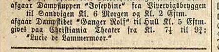 Most likely this refers to a performance held at the Christiania Theater those July days. In the newspaper Aftenposten on that very Friday night, we find an announcement about the Donizetti-opera: Lucie de Lammermoor. (An other possibility can be that the ‘Lucie’ who is written down in the diary refers to the actress Lucie Wolf. She was a big celebrity in those days, after she moved from Bergen to Christiania in 1854 and started performing at the Christiania Theatre.)