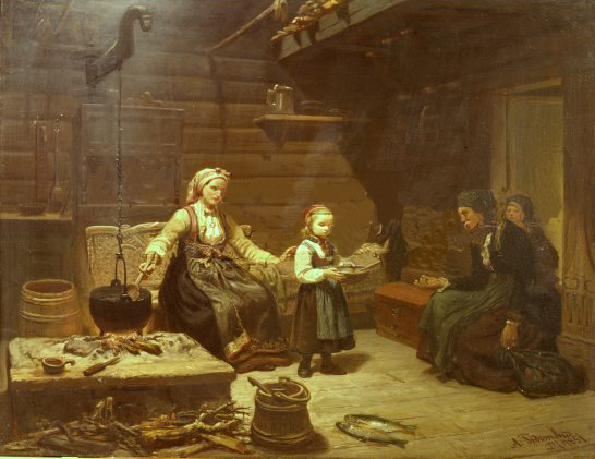 Legg spesielt merke til veden under bordet, gryta, trebøttene og kvinnens klesdrakt.